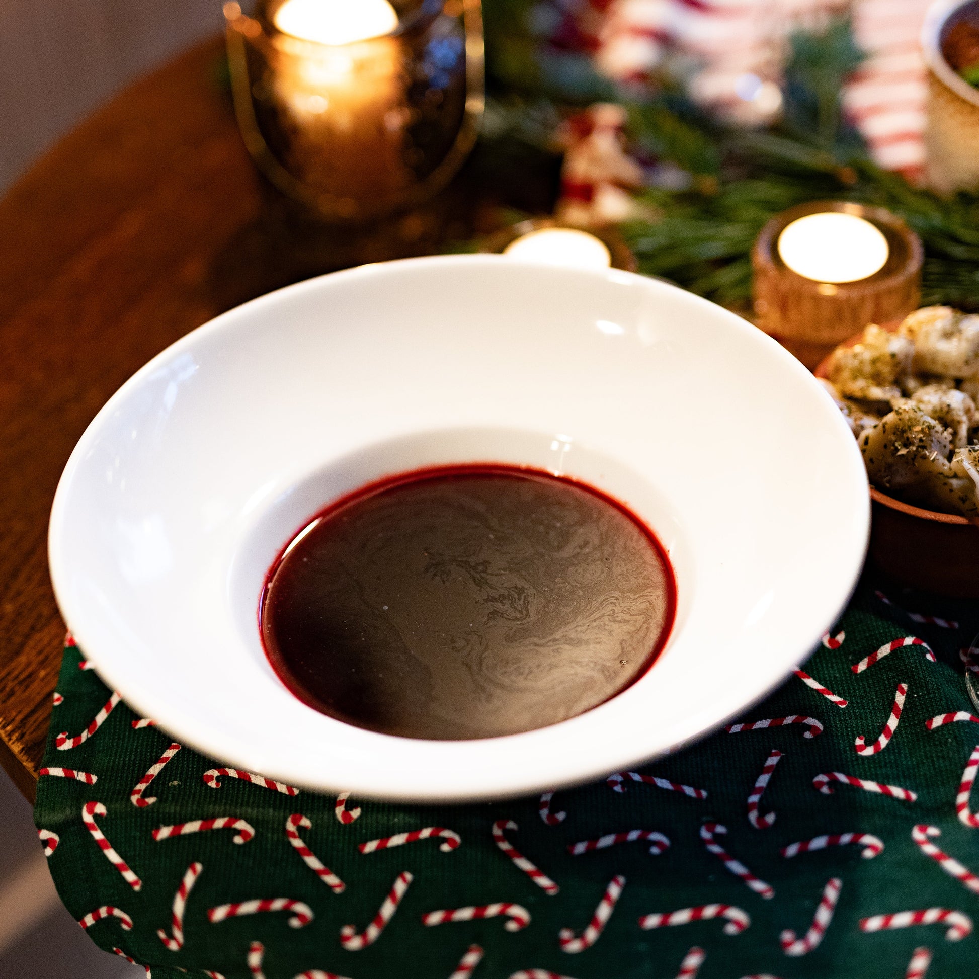 Wyrazisty barszcz o głębokim, rubinowym kolorze, gotowany na wędzonych żeberkach. Idealny balans kwasowości i aromatu wędzonki.