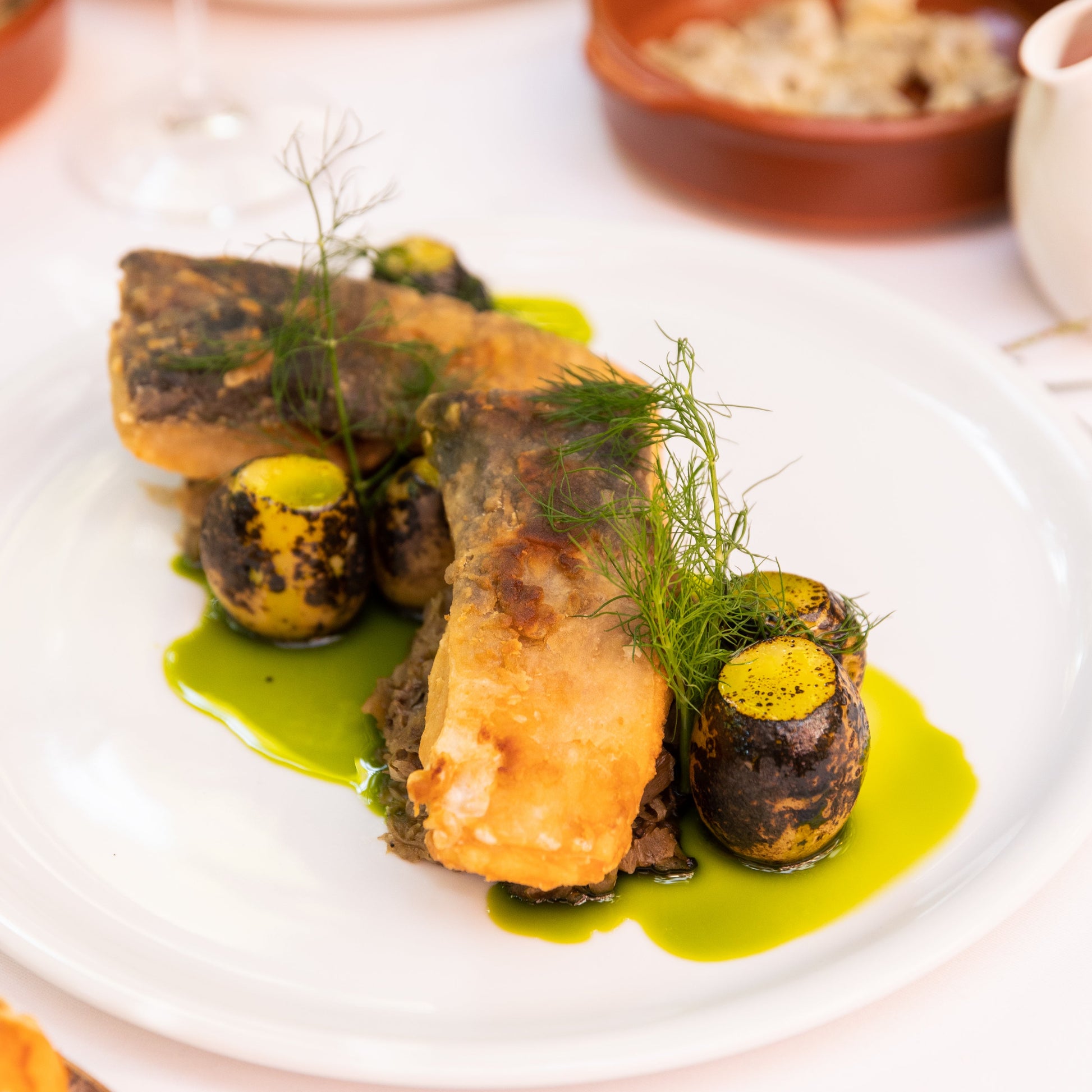 Soczysty filet z łososia pieczony na złoto, podany z aksamitnym musem chrzanowym.